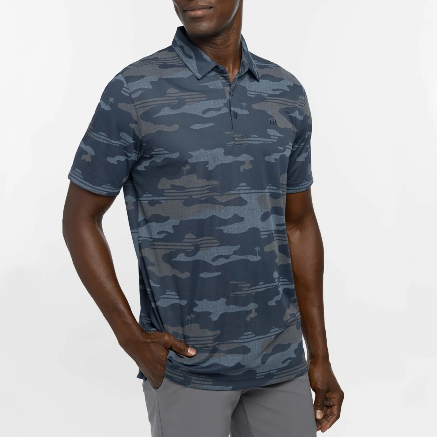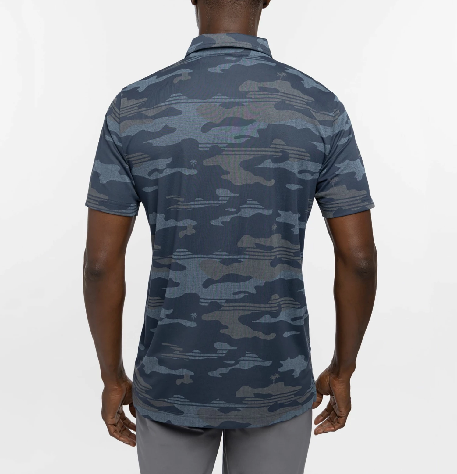 - Linen-textured camo print with hidden palm trees